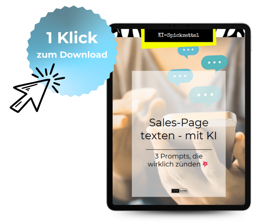 On top findest Du etwas weiter unten in diesem Beitrag meinen genialen KI-Spickzettel, mit 3 saustarken Prompts, die Dir das Texten Deiner Sales Page wirklich erleichtern (statt Dich immer tiefer in die Welt der tausend Möglichkeiten zu entführen).